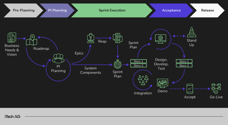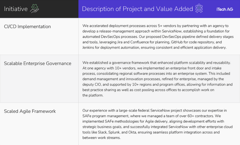 At iTech AG, we employ a combination of a proven governance framework, expertise in DevSecOps and CI/CD, and the Scaled Agile Framework to enhance efficiency in multi-vendor federal environments. Here is how we do it: